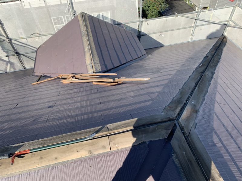 まず屋根をふらっとにするため棟板金と下地の木材を取り除きます。