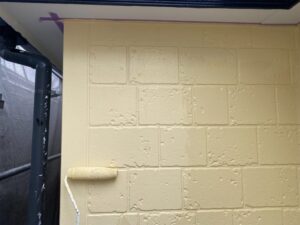 二階部分の上塗りです。二回目を仕上げるとだいぶ色がおちょついてきます。