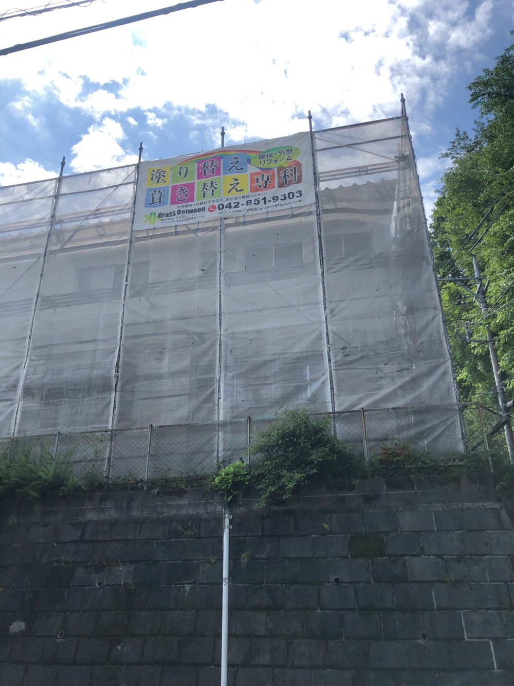 昨日は大雨で工事も中止になりましたが、足場屋さんの活躍で本日から工事をスタートできるようになりました。