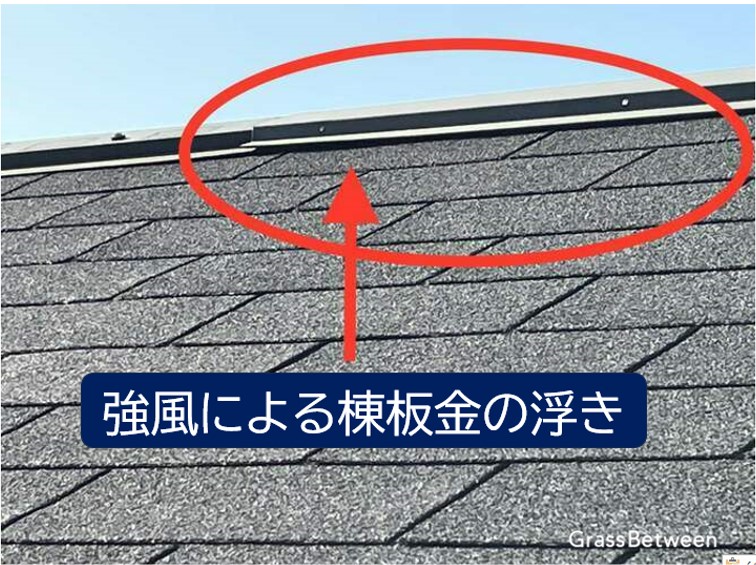 • 危険度3: 板金の浮き板金を固定していた釘が抜けてしまうと、板金自体が浮いてきてしまいます。このように浮きの隙間が出来ると、強風が浮いた隙間に入り込み棟板金を剥がしてしまう恐れがあります。実際に、大きな台風の直後は板金の飛散被害が増えました。板金が飛散すると、近隣に大きな被害を与える可能性が出てきます。
