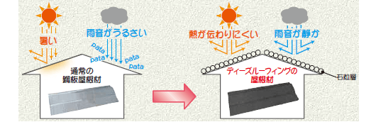 ディプロマットとエコグラーニは、アメリカ・カリフォルニア産の高耐久屋根材で、株式会社ディートレーディングが開発しました。両者はジンカリウム鋼板を基材としており、表面は自然石粒でコーティングされています。この構造により、以下の特長を持っています。