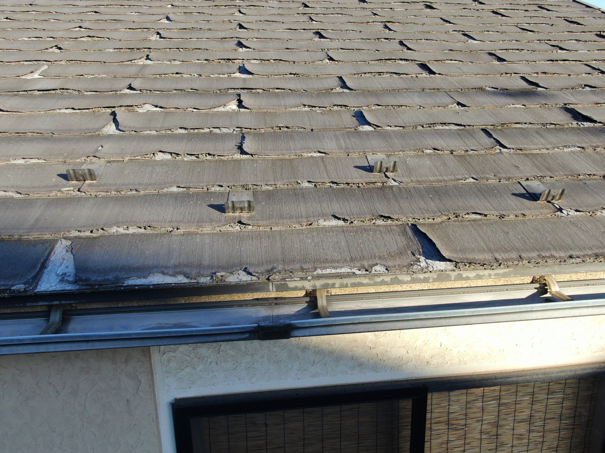 ちょうど2年前のこの時期の風で我が家の屋根もこんな感じにかけらが道路に飛び散りました。