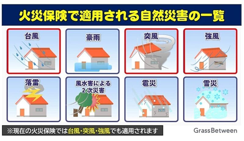 | 火災 | 落雷 | 破裂・爆発 | 風災・雪災・雹災 | 水害 | 水漏れ | 暴行・破損 | 物体飛来・落下・衝突 | 盗難 | |