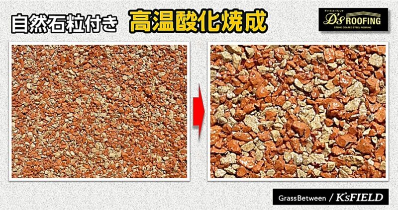 ジンカリウム鋼板をベースに、石粒を超高温でガラスコーティング(高温酸化焼成)した屋根材で、その名の通り「高耐久性」「屋根の再塗装不要」など非常に優れた屋根材です