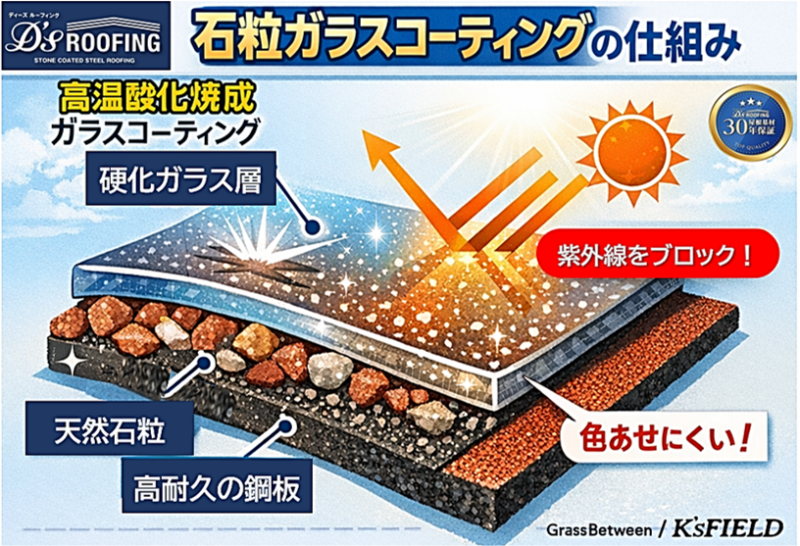 この石粒が 紫外線・雨・風 を直接受け止め、金属本体を守ります。