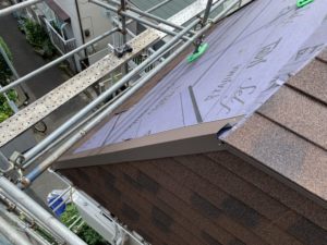 あとは正面と裏の急勾配部分です。ケラバの板金を取り付けてから本体を貼っていきます。