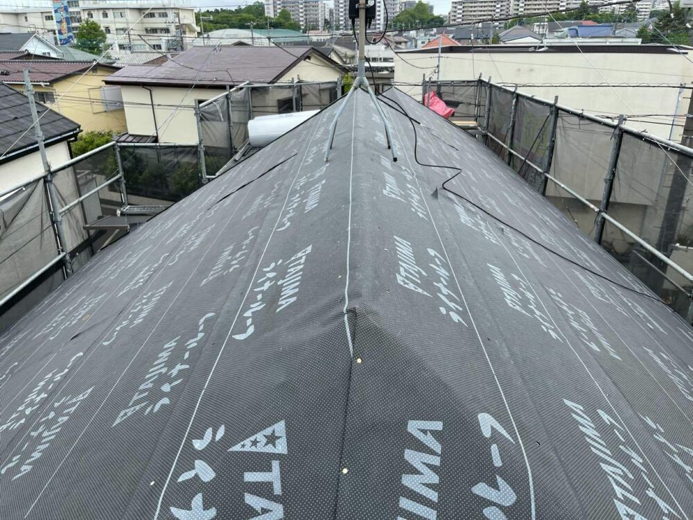 軒下スターターを設置後、軒から屋根上部に向かって新しい屋根材(ディーズルーフィング)を設置していきます。