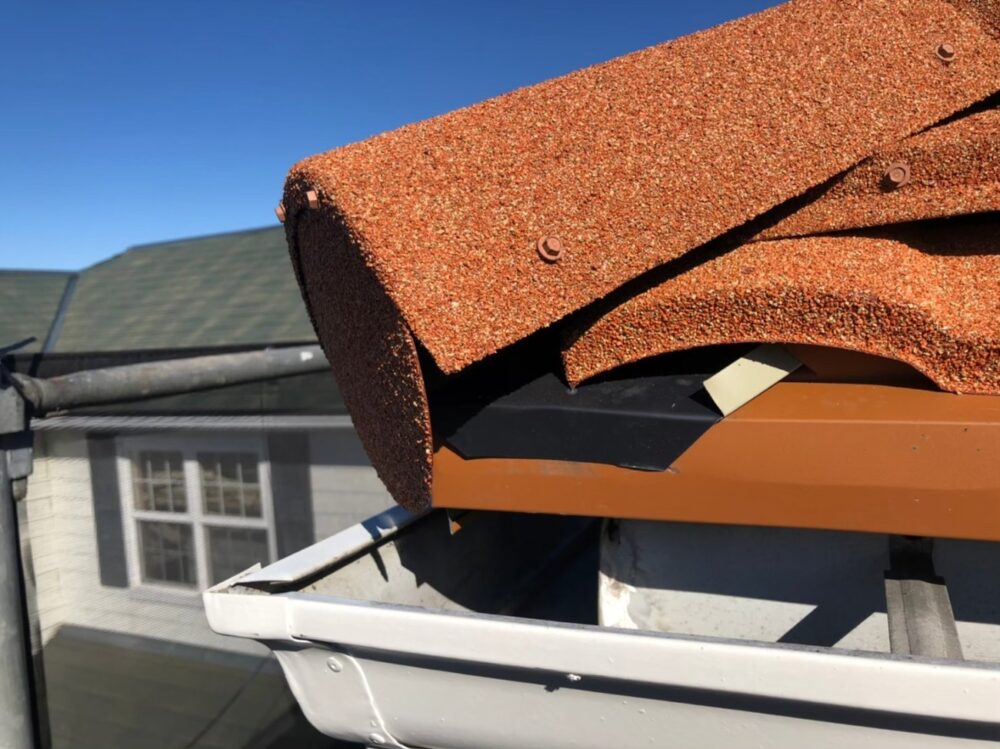 屋根材の継ぎ目には、しっかりとコーキングをして同質材の石粒を塗布して屋根材の継ぎ目も奇麗に仕上がりました。
