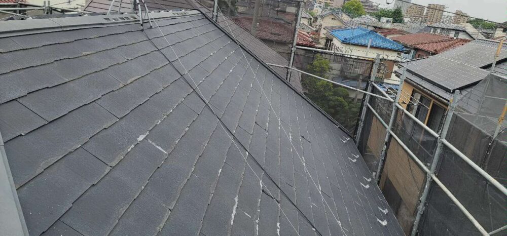 屋根の高圧洗浄とは、屋根を塗装する前やカバー工法を行う前に表面についた塗膜や汚れを高圧洗浄機を使用してきれいに洗い流す行程のことです。